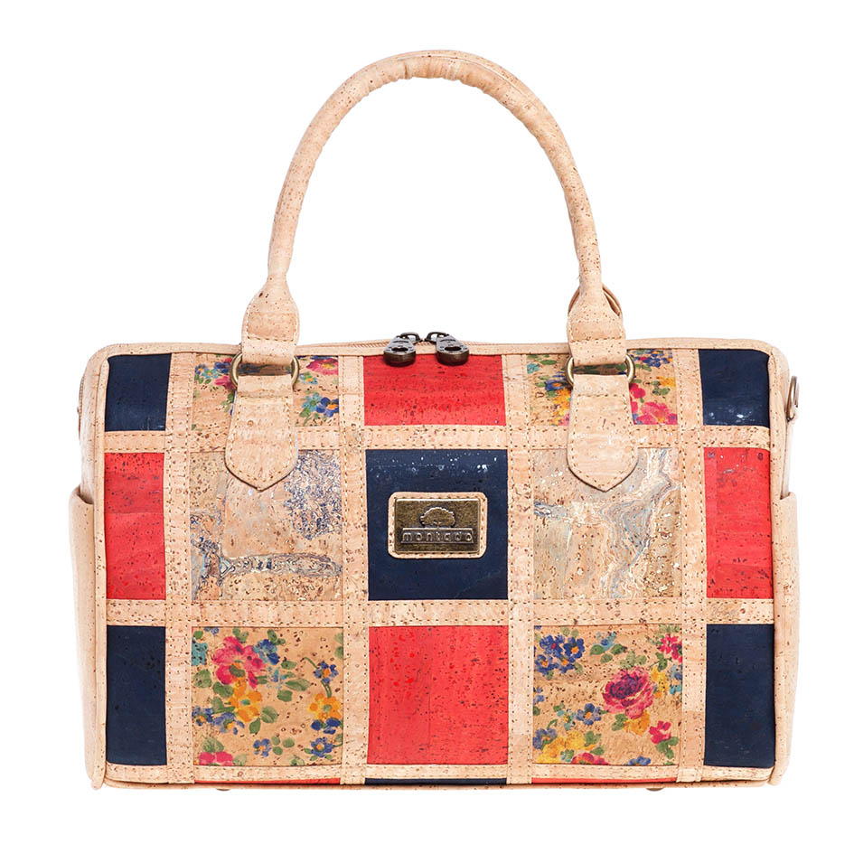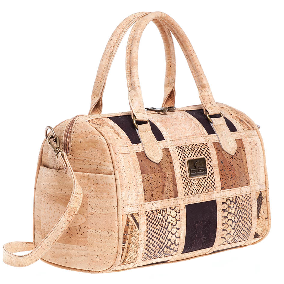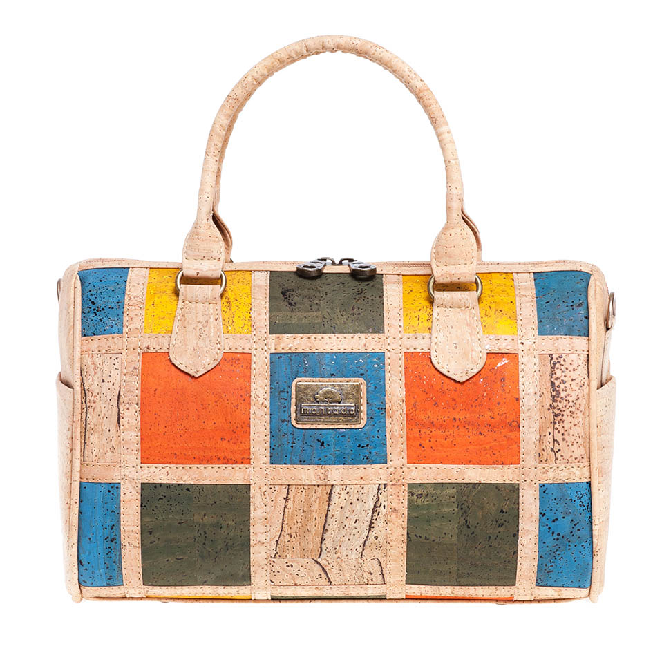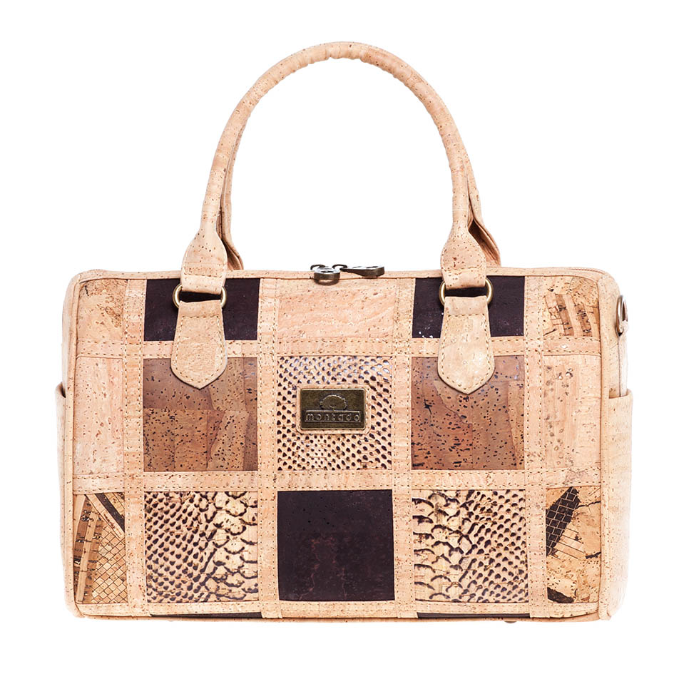 Vegan σάκος με μοτίβο μπαλώματος στο μπροστά μέρος. Στο εσωτερικό έχει μία θήκη για κινητό τηλέφωνο και μία τσέπη με φερμουάρ. Έχει δύο χερούλια από φελλό και ένα επιπλέον λουρί αφαιρούμενο και ρυθμιζόμενο. Κανένα ζωικό υλικό δεν χρησιμοποιήθηκε στη διαδικασία παρασκευής αυτού του προϊόντος.