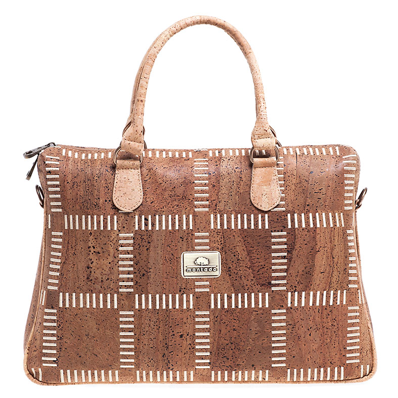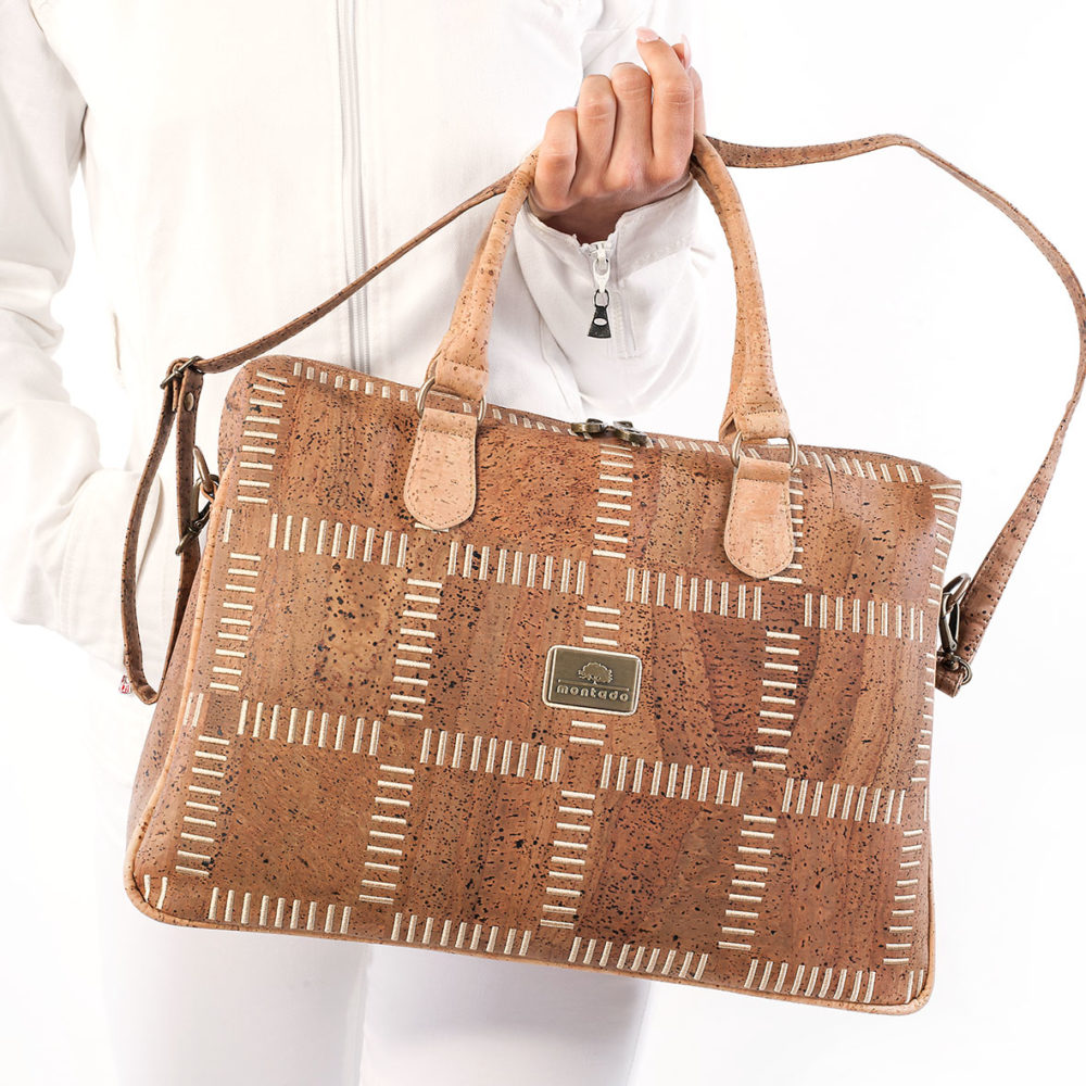 Vegan Γυναικείος Χαρτοφύλακας από Φελλό με Τετράγωνο Κέντημα. Ο χαρτοφύλακας έχει δύο χερούλια με επιπλέον αποσπώμενο λουρί ώμου με ρυθμιζόμενο μέγεθος. Έχει επίσης μια εξωτερική θήκη με φερμουάρ στο πίσω μέρος και άλλη μια θήκη για κινητό τηλέφωνο. Κανένα ζωικό υλικό δεν χρησιμοποιήθηκε στη διαδικασία παρασκευής αυτού του προϊόντος.
